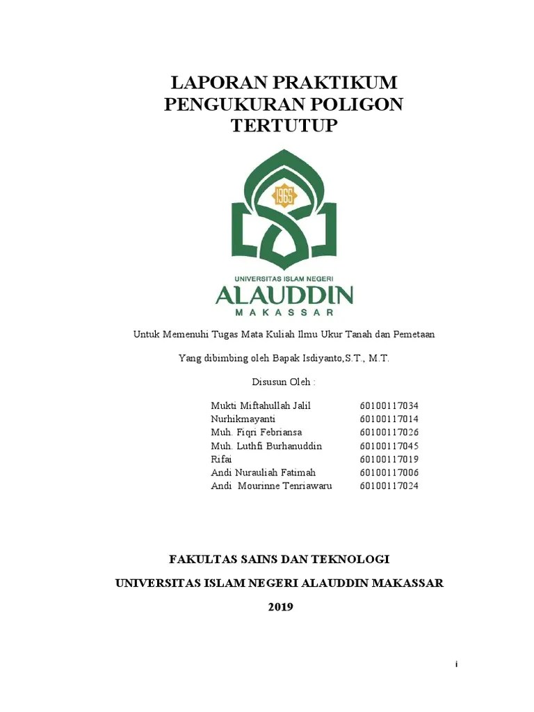 Alat ukur sudut theodolite dan statif; Agar mahasiswa mampu dan terampil dalam menggunakan alat theodolit sesuai dengan prosedur. Dan pengalaman dalam teknik pengukuran luas suatu daerah serta penggunaan alat theodolit. Tujuan penyusunan laporan ppl ini adalah untuk memeberikan. Koleksi admin mengenai contoh laporan pengukuran poligon tertutup lengkap pdf. 7/26/2019 laporan poligon tertutup 1/22bab ipendhuluana. Yaitu berupa data hasil pengukuran poligon tertutup. Penghitungan poligon tertutup (3x pertemuan). Statip digunakan untuk mendatarkan alat ukur theodolit agar dapat digunakan sesuai dengan fungsinya . Itulah yang dapat kami bagikan terkait laporan pengukuran poligon tertutup dengan theodolit. Pada pengukuran poligon peralatan yang diperlukan adalah: Acara praktikum, waktu dan tempat. Latar belakang bola bumi pada hakikatnya mendekati bentuk ellipsoida putar, sehingga untuk pengukuran pada permukaan .